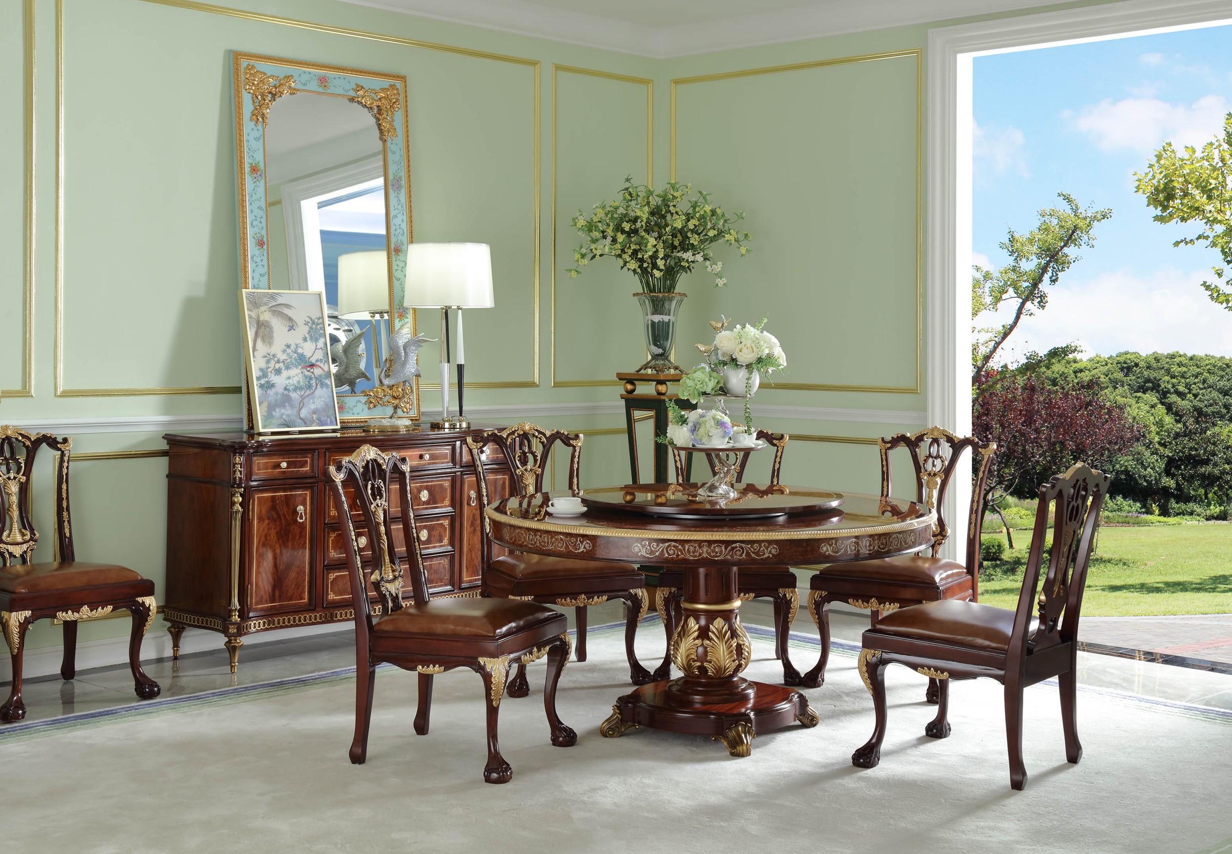 MZ-809C-1圆餐台(1500×760);MZ-809Y-5餐椅(545×620×980);MZ-808R餐具柜(1585×522.5×900)